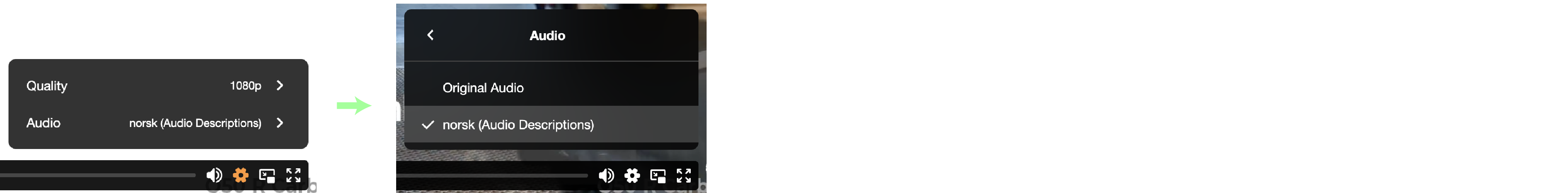 Slik skrus synstolking på i Vimeo: Velg settings, audio, norsk (audio description).