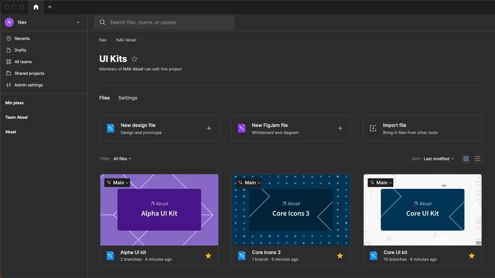 Under NAV Aksel i Figma finner du bibliotekene vi bruker i NAV. Les mer her om hvordan du kommer i gang.