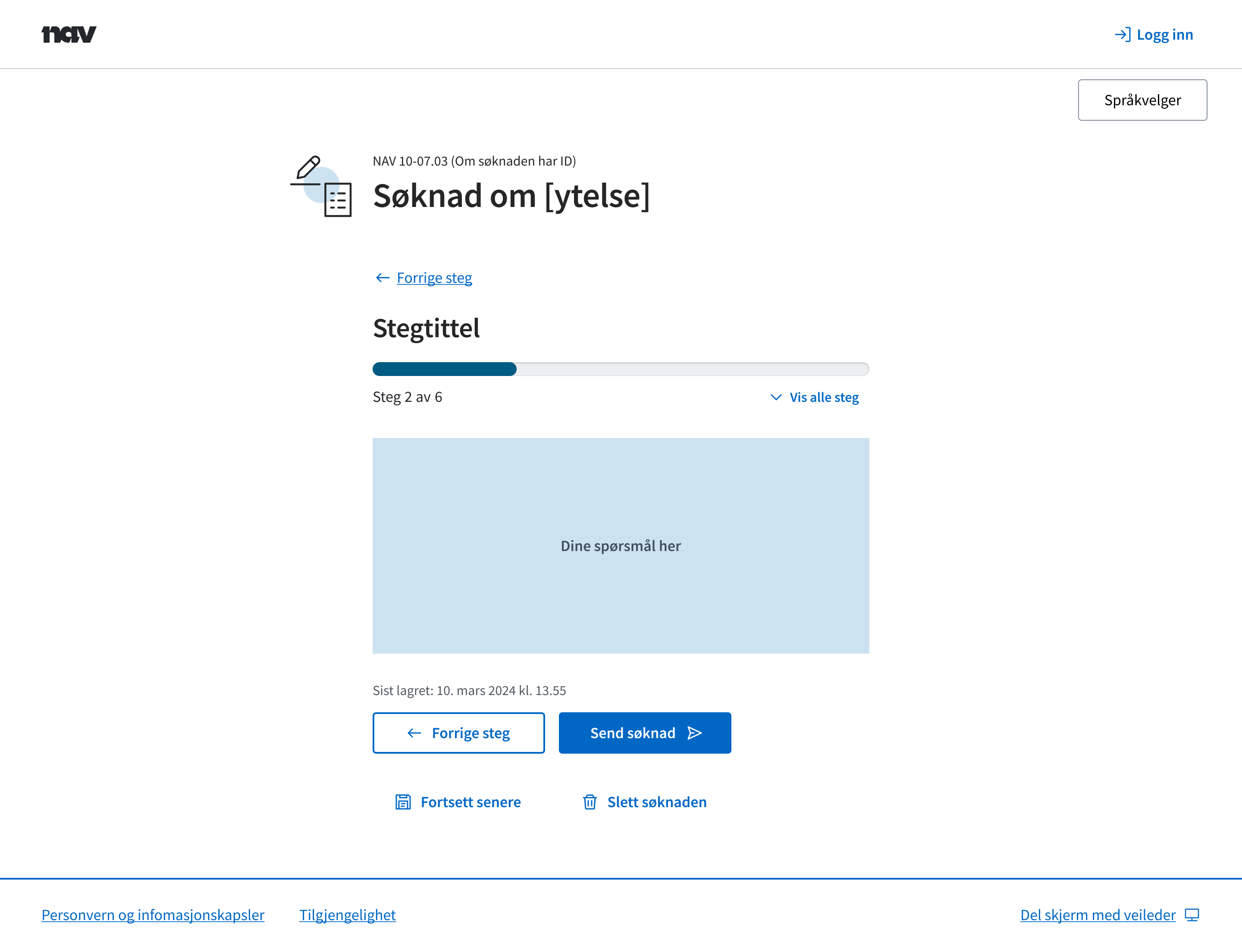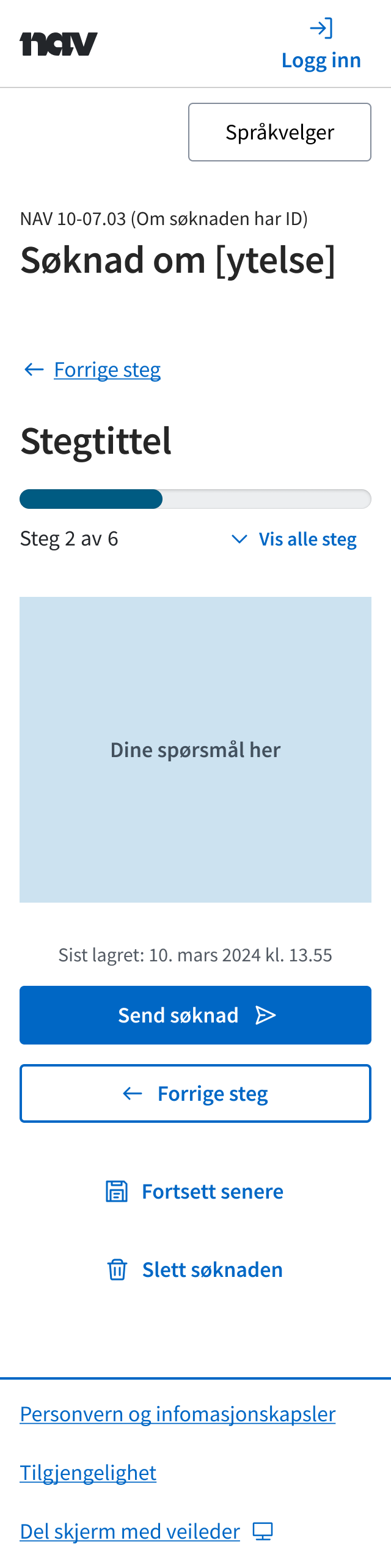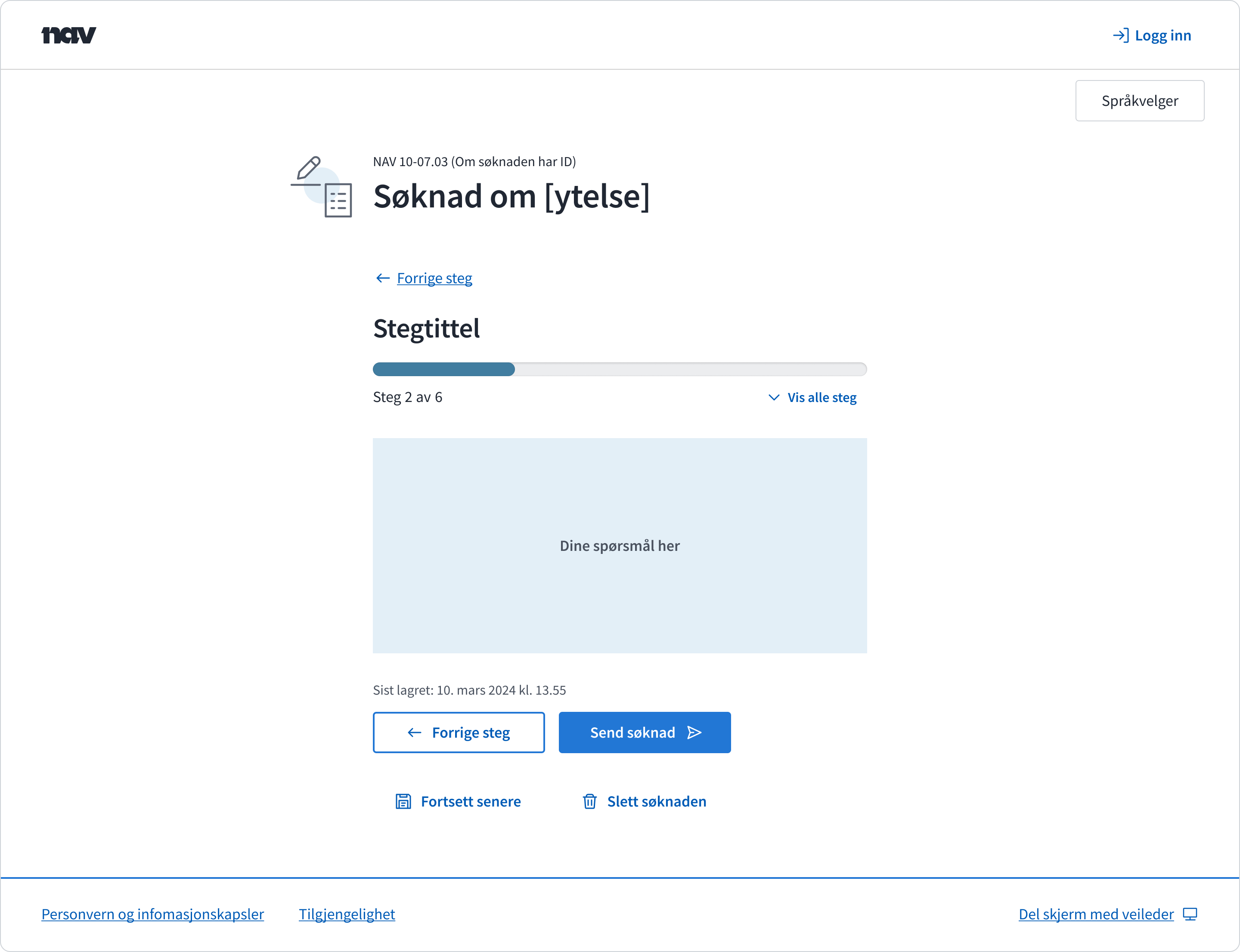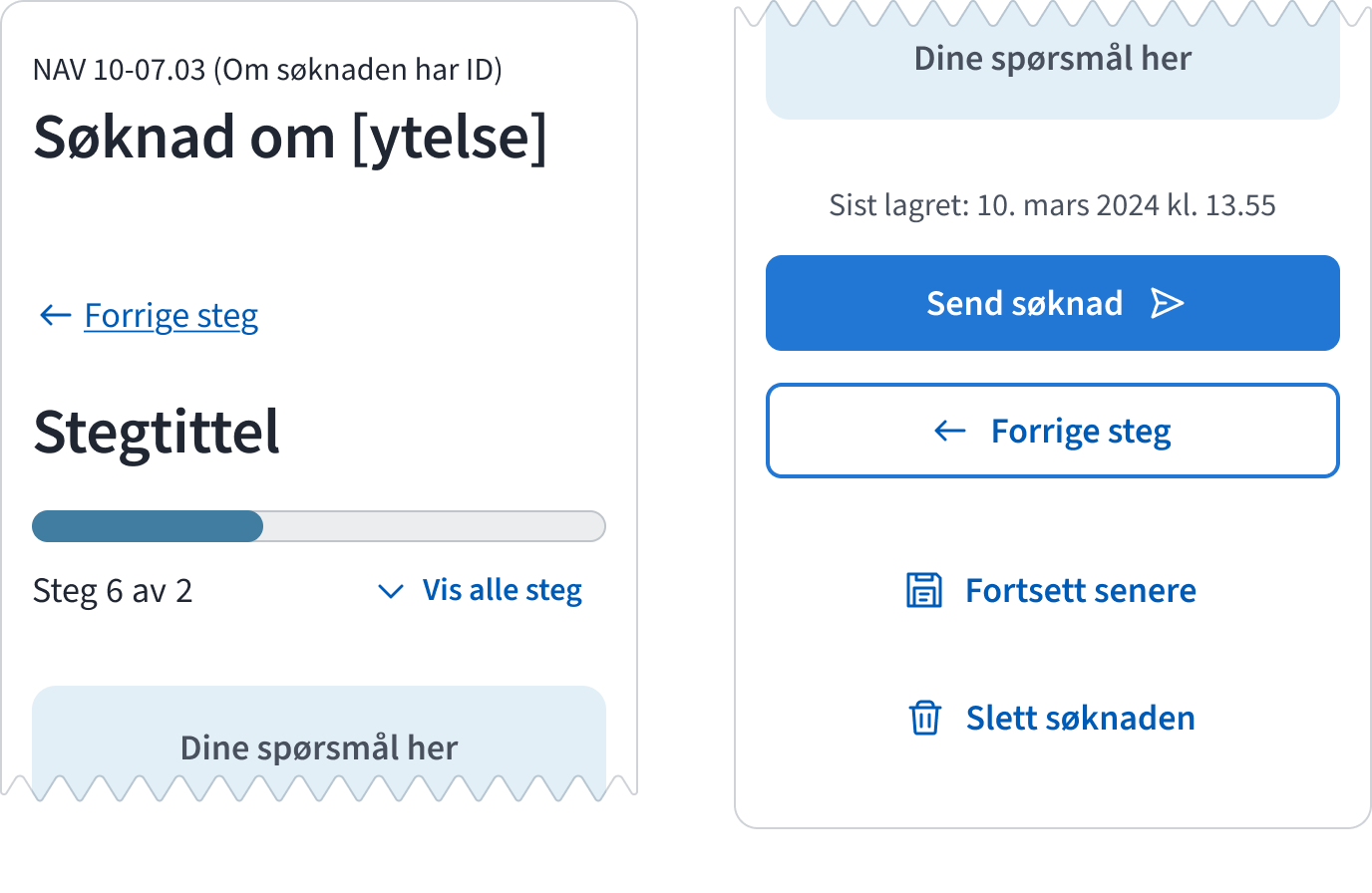 På desktop plasseres forrige- og neste-knappene ved siden av hverandre. Neste-knappen skal stå til høyre, for å gjenspeile brukerens fremdrift i skjemaet. Send-knappen erstatter neste-knappen når skjemaet er ferdig utfylt. Avbryt-knappen plasseres nederst, under neste- og forrige-knappene, da dette er handlingen færrest skal utføre.