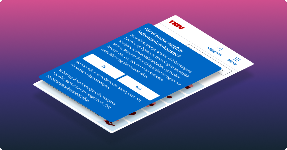 Vi har utformet cookie-banneret for å skille seg tydelig fra annet innhold på sidene, samtidig som vi bruker formspråket og designsystemet. Valgene «Ja» eller «Nei» er likestilte, slik retningslinjene krever.